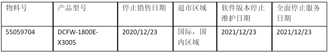 北京Ezpay数码云科信息技术有限公司正式通知您, 以上DCFW-1800E-X3005下一代防火墙(55059704)将于2020年12月23号停止接收新的订单(具体日期见上表),不再供货。给您带来的不便,敬请原谅。